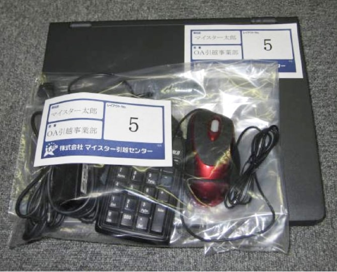 また、キーボード・マウス・ケーブル等は専用袋に入れ、同一番号のラベルを貼ってください。